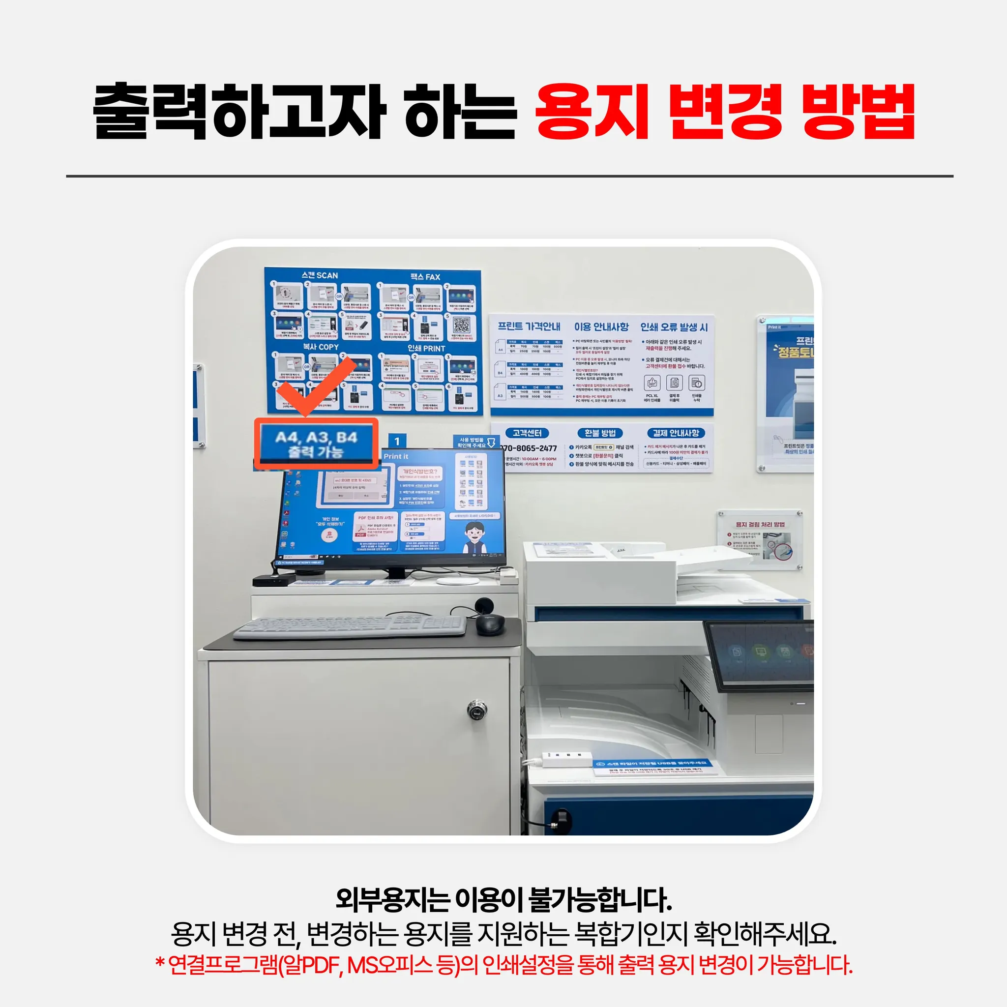 - 연결프로그램(알PDF, MS오피스 등)의 인쇄설정을 통해 출력 용지 변경이 가능합니다.