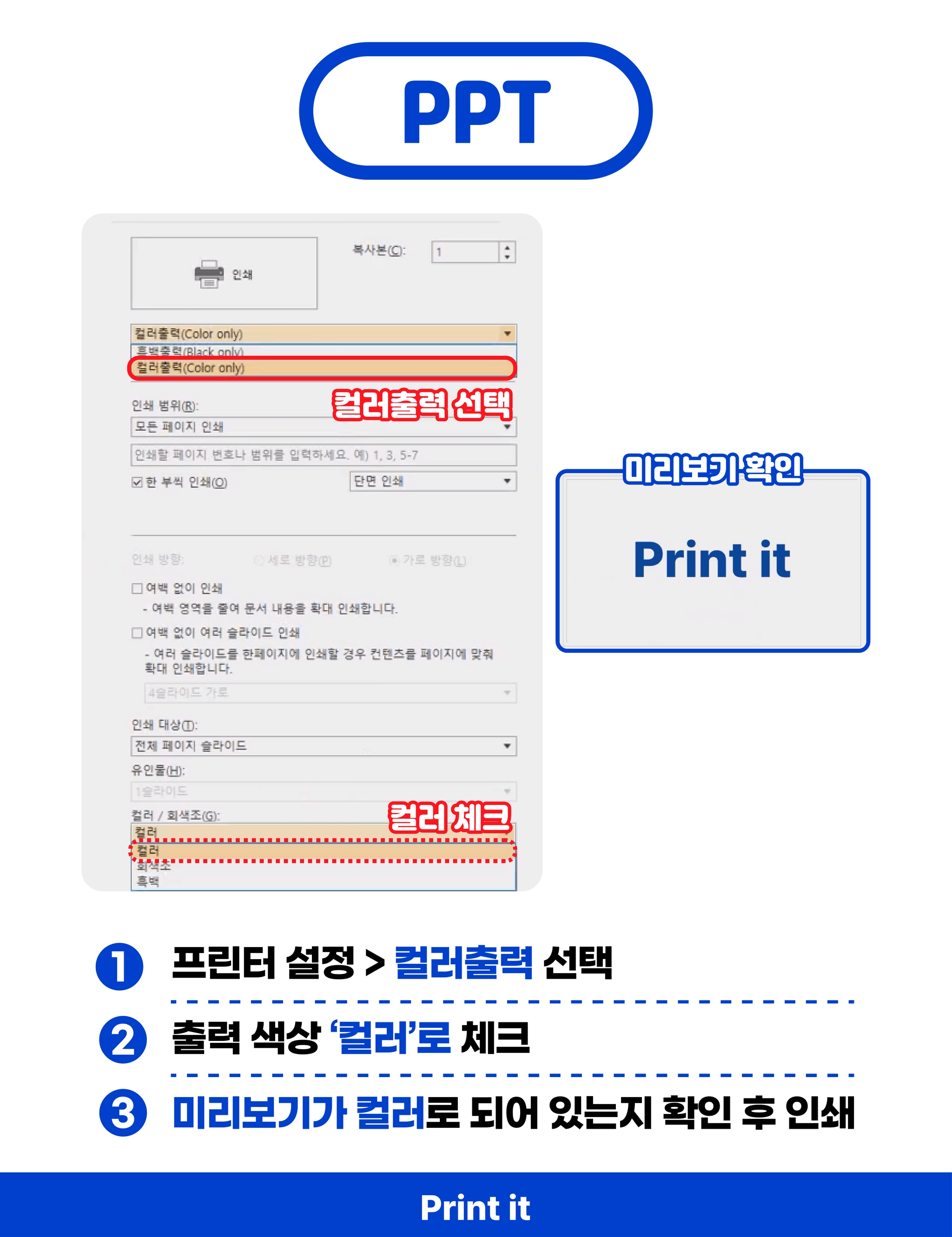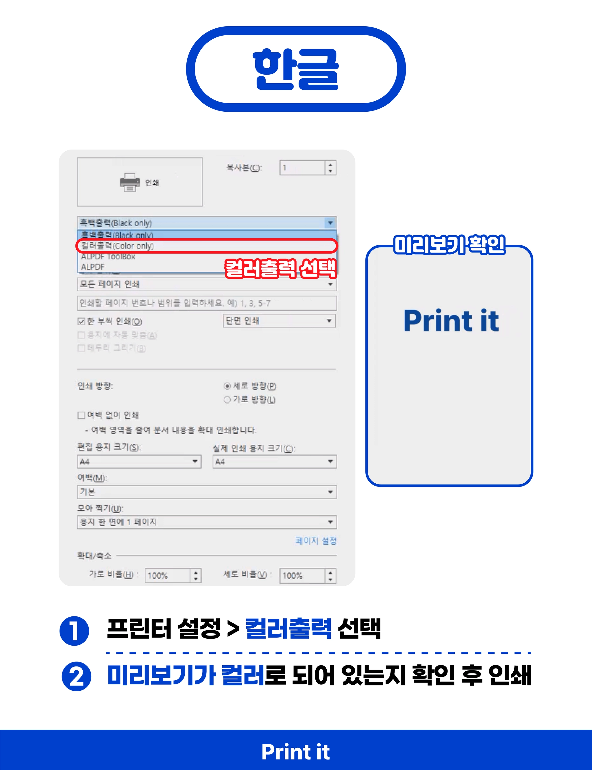 이 올바른지 확인해주세요. (컬러출력의 경우