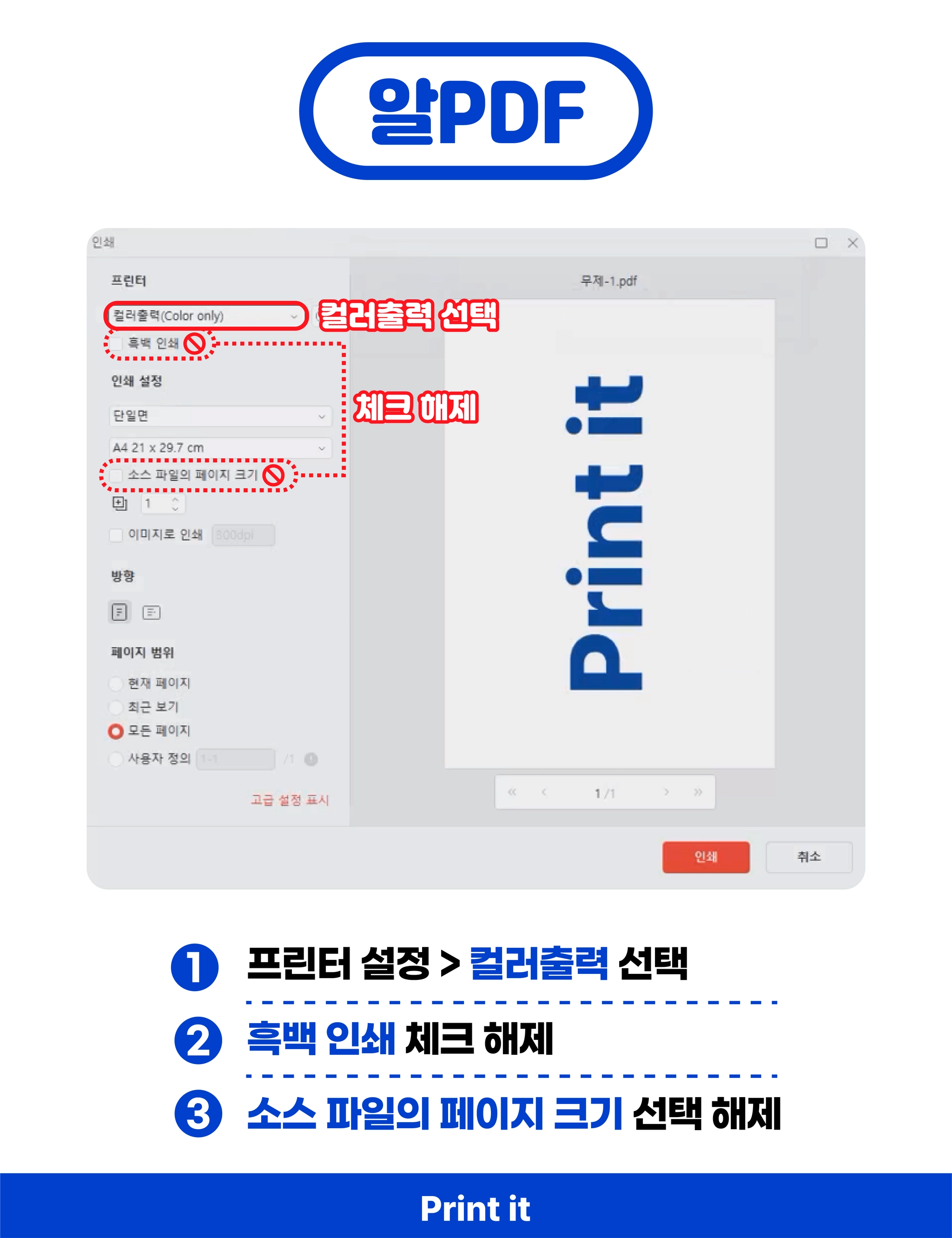 PDF 컬러 출력 오류 시 확인 해야 할 사항
