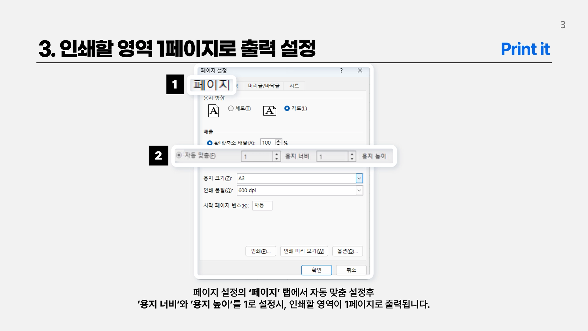 인쇄할 영역 1페이지로 출력 설정